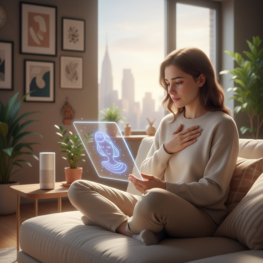 Osoba korzystająca z aplikacji AI wspierającej radzenie sobie z blokadami emocjonalnymi