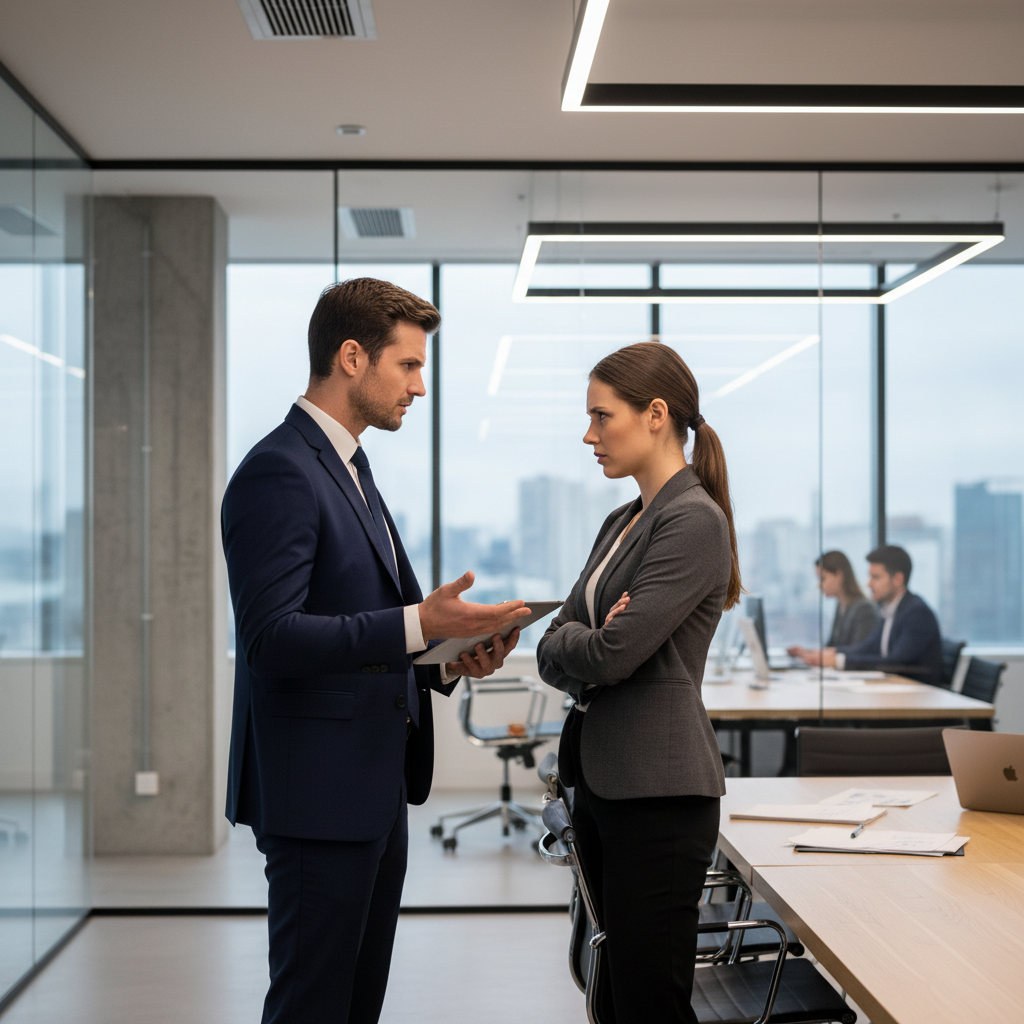 Dwoje współpracowników w napiętej rozmowie w biurze, blokady emocjonalne w pracy