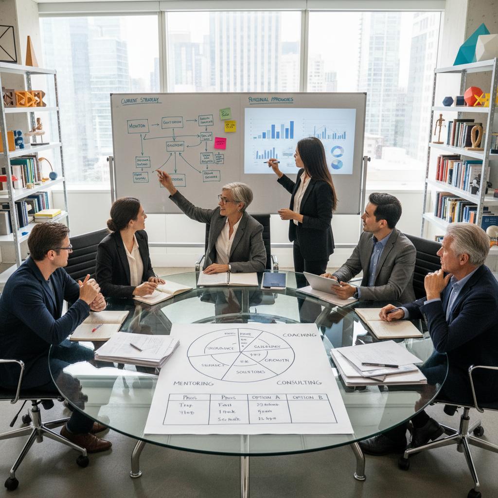 Partnerska relacja oparta na wymianie doświadczeń i wspieraniu długofalowego rozwoju. Mentor nie daje gotowych rozwiązań – raczej prowokuje do refleksji i dzieli się własnymi błędami.
