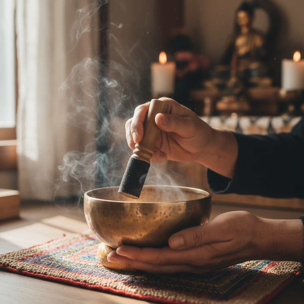 - Rozpocznij od krótkiego uderzenia misy – wsłuchaj się w rezonans.