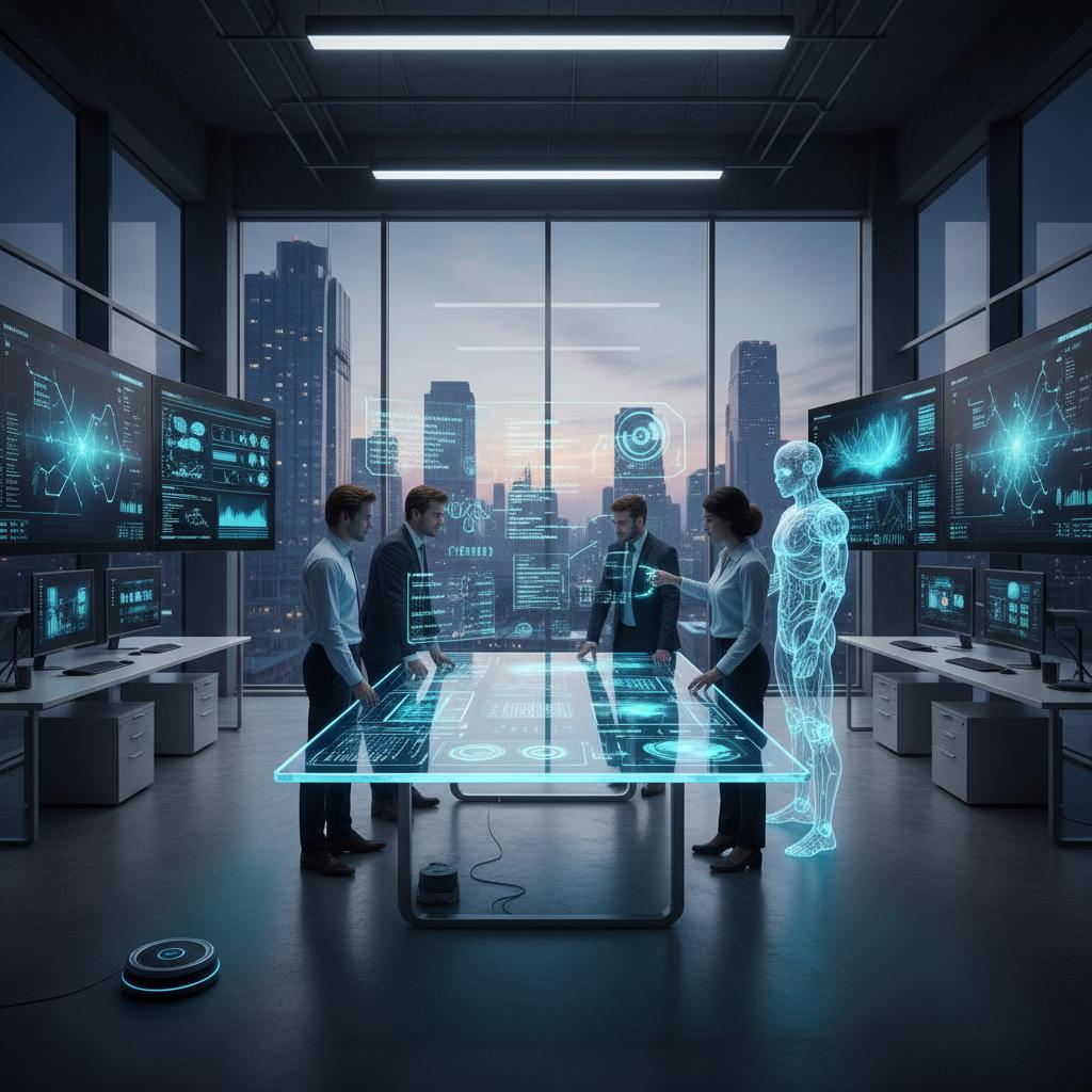 Nowoczesne biuro, pracownicy przy komputerach, widoczne technologie AI, wyraźne skupienie