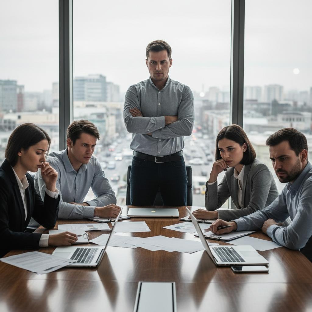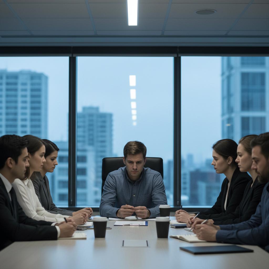Spotkanie zespołu, jedna osoba wyraźnie zaniepokojona, reszta w milczeniu akceptuje decyzję