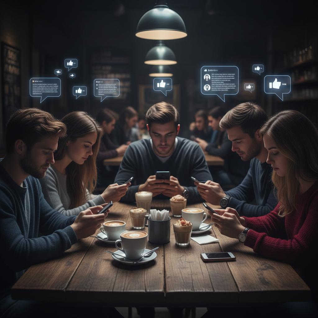 Grupa młodych ludzi korzystających z telefonów, widoczne ekrany social mediów, wyraźna izolacja