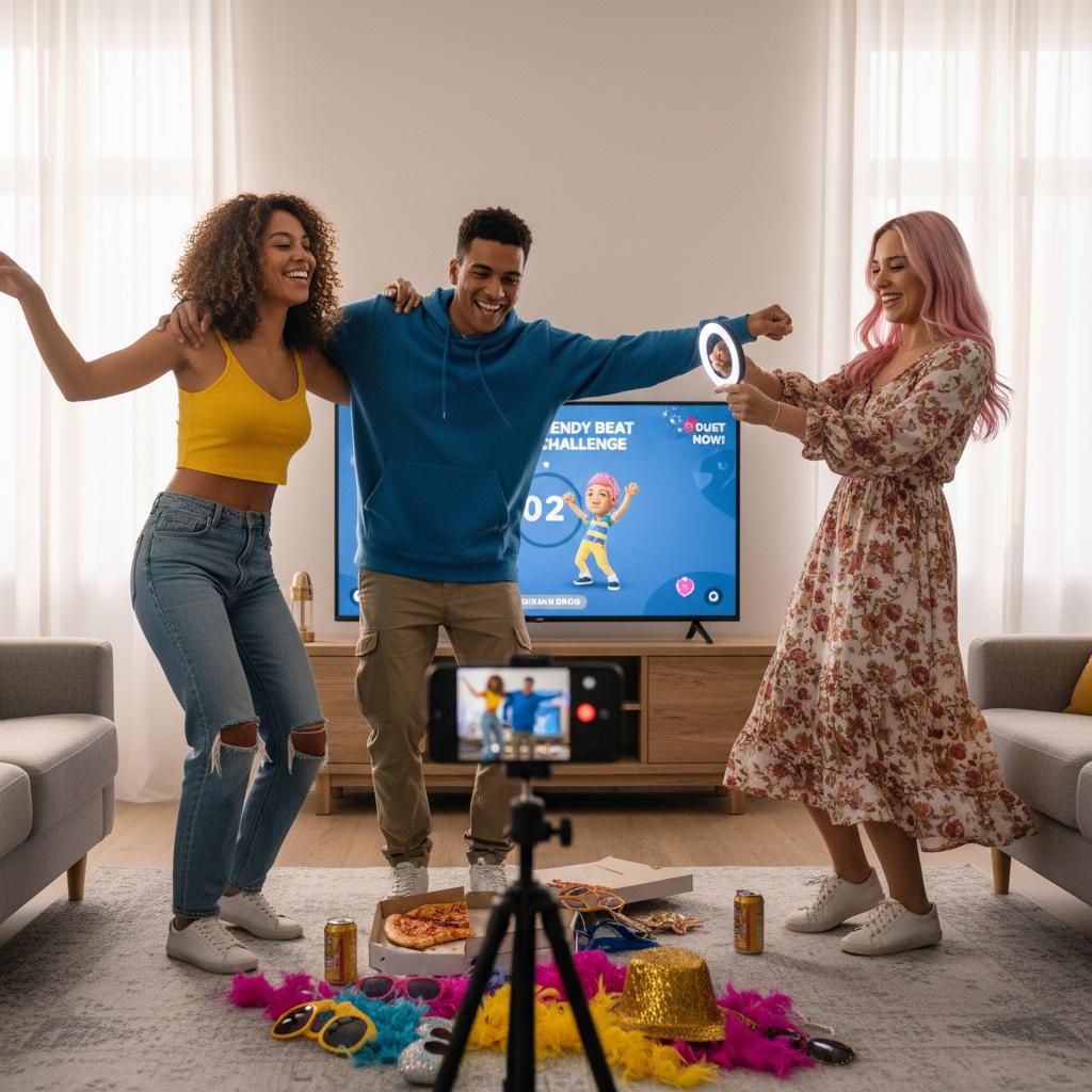 Zdjęcie: Grupa młodych ludzi nagrywających challenge na TikToka – współczesny mechanizm wpływu społecznego